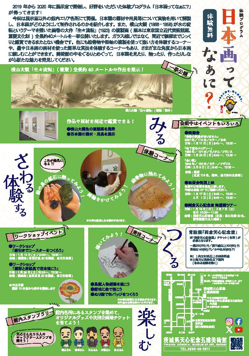 今回は展示室以外の館内エリア各所にて開催。日本画の画材や用具等について実物を用いて解説し、日本画がどのようにして制作されるのかを紹介します。また、横山大観(1868-1958)が水の変転というテーマを描いた画巻の大作「生々流転」(1923)の複製画(原本は東京国立近代美術館蔵、重要文化財)全長約40メートルを一挙公開いたします。ガラス越しではなく、間近で細部までじっくりと鑑賞できるまたとない機会です。他にも絵巻物や掛軸の複製を使って扱い方を体験するコーナーや、墨や日本画の画材を使った簡単な実技を体験するコーナーもあり、さまざまな角度から日本画に親しむことができます。美術館の中をぐるりとめぐって、日本画を見たり、触ったり、作ったりしながら新たな魅力を発見してください。